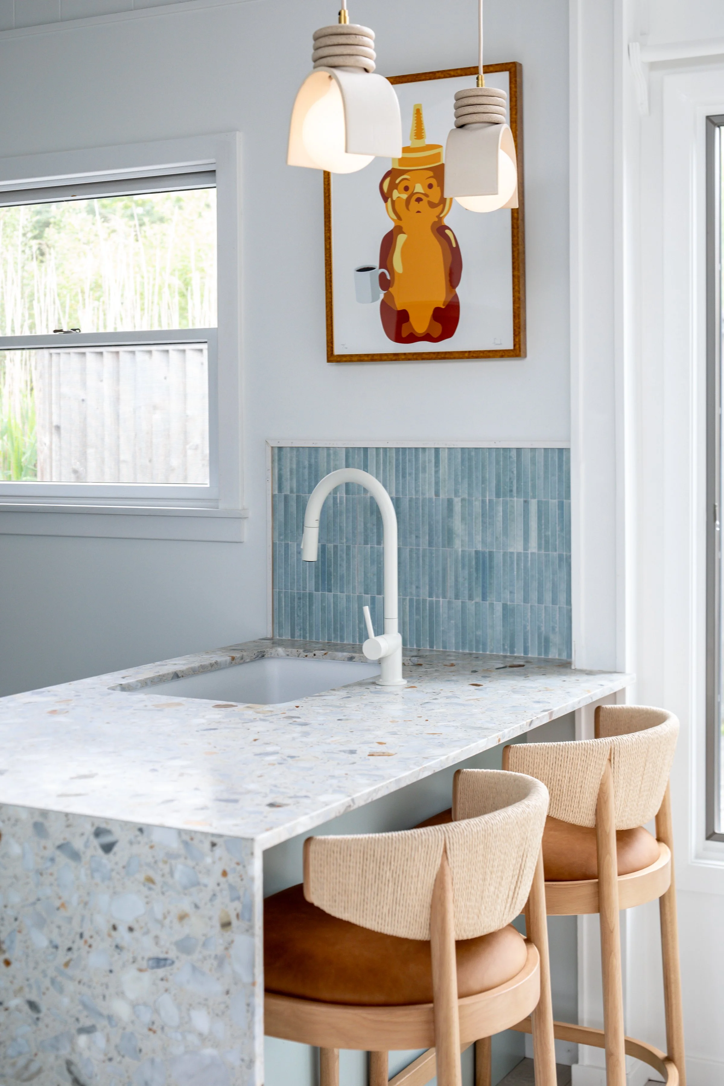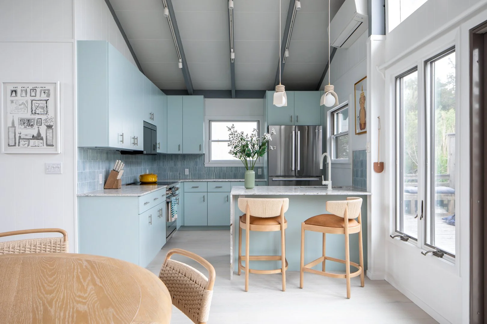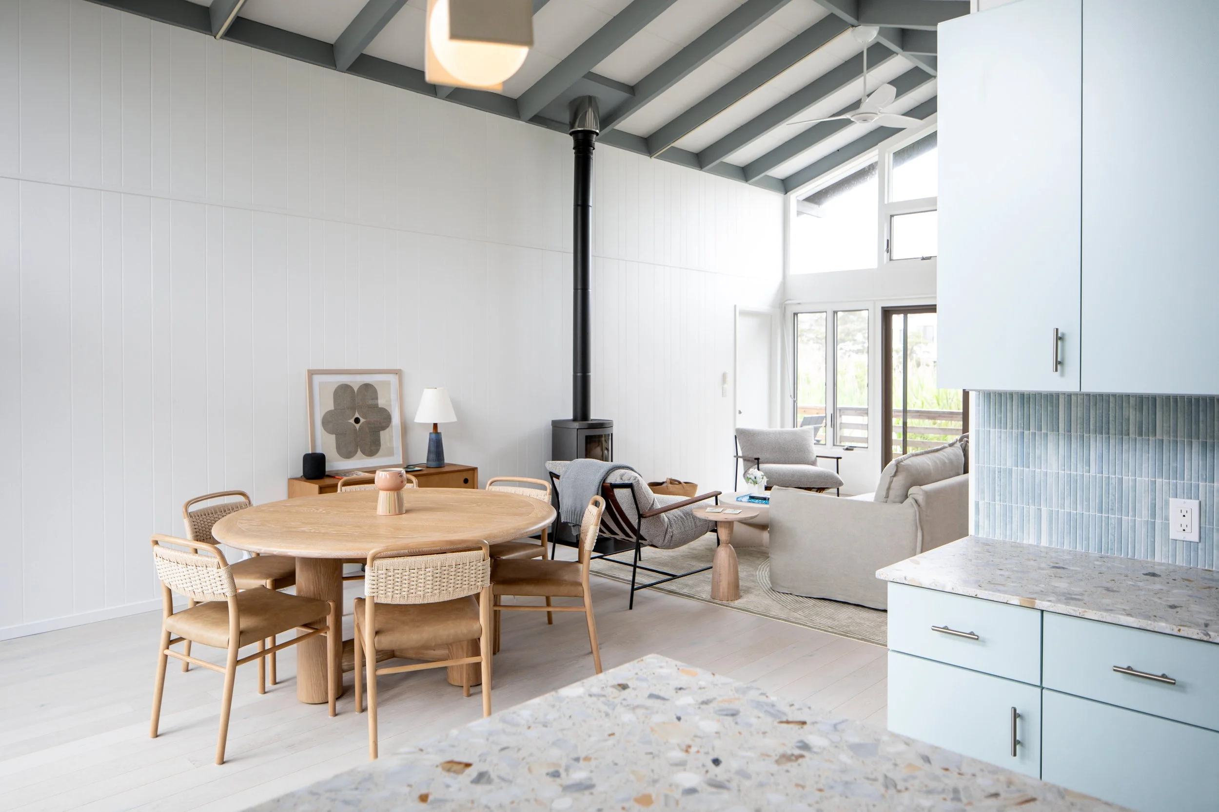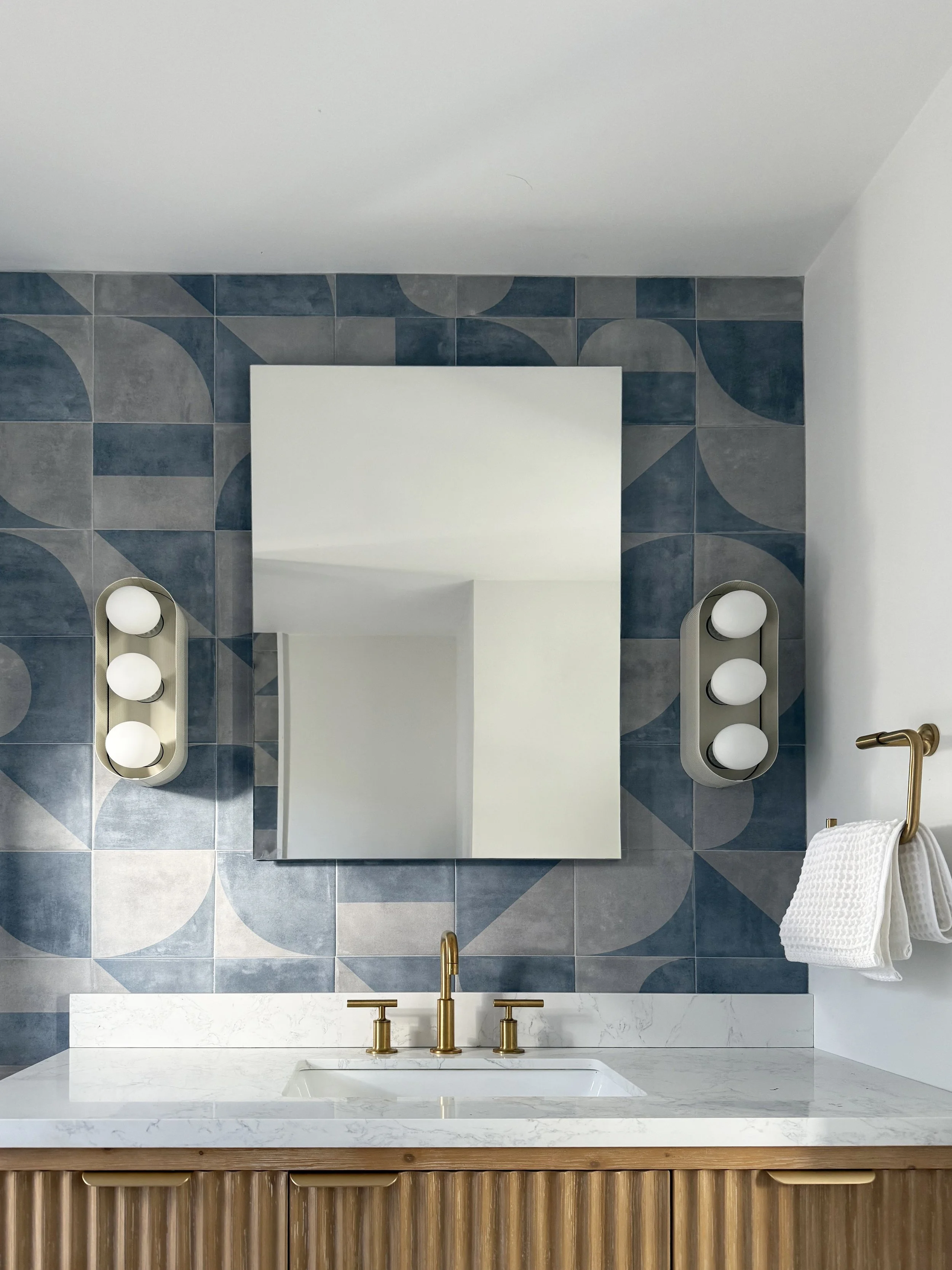 This project reflects the tranquil and bright atmosphere of the environment of Fire Island. Our team hand-selected finishes and furniture that focused on soft blue hues and natural materials to welcome in the spirit of the outdoors. Clear, quiet elements combined with unique tilework and wallpaper, transforms this space into a visually captivating, yet peaceful hideaway.