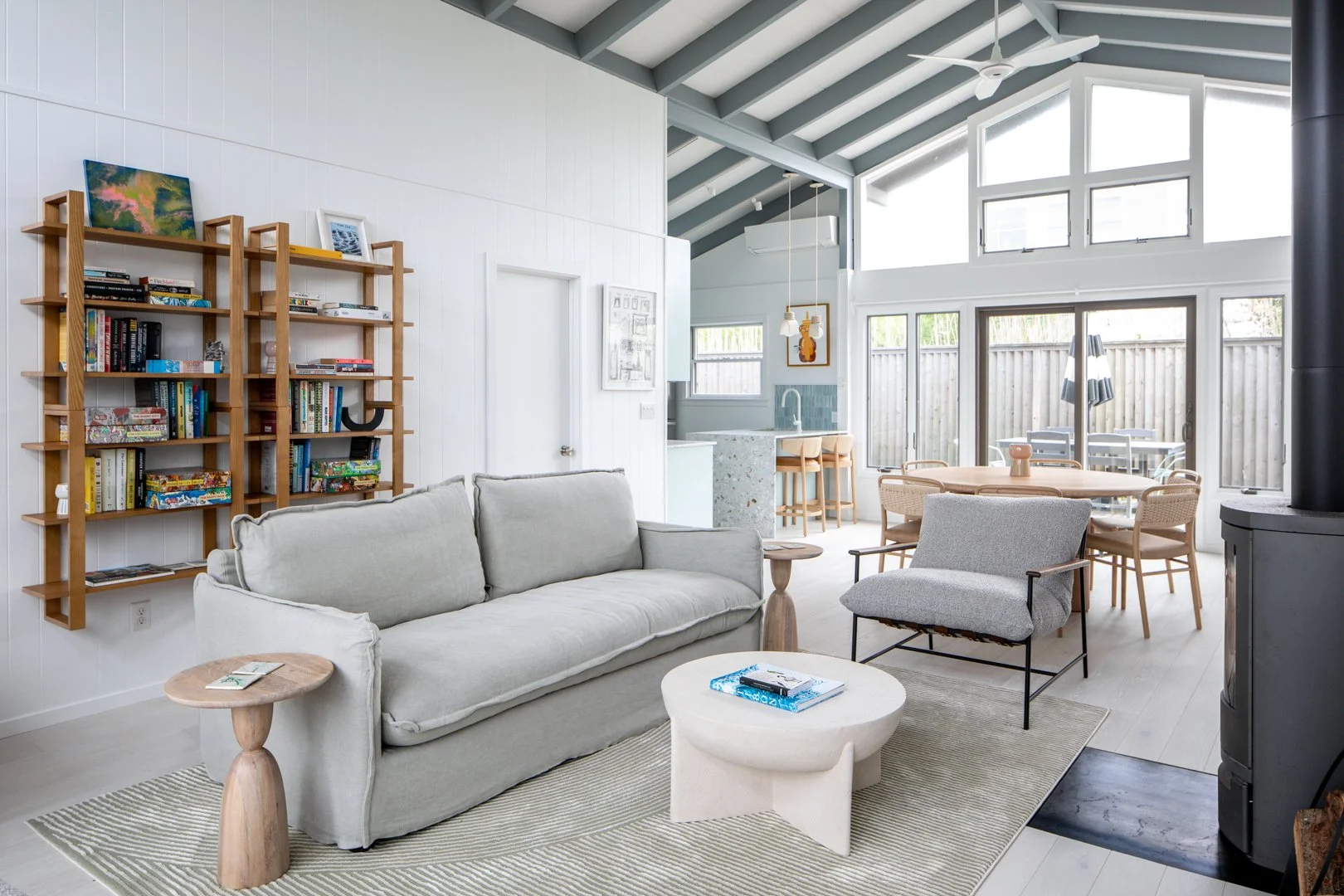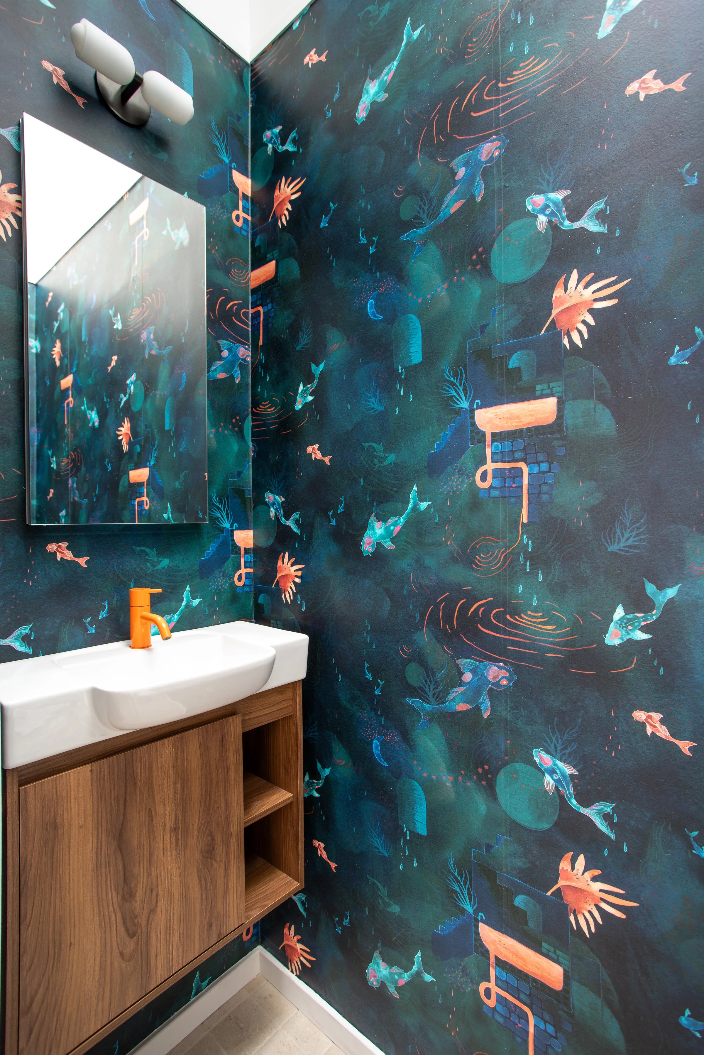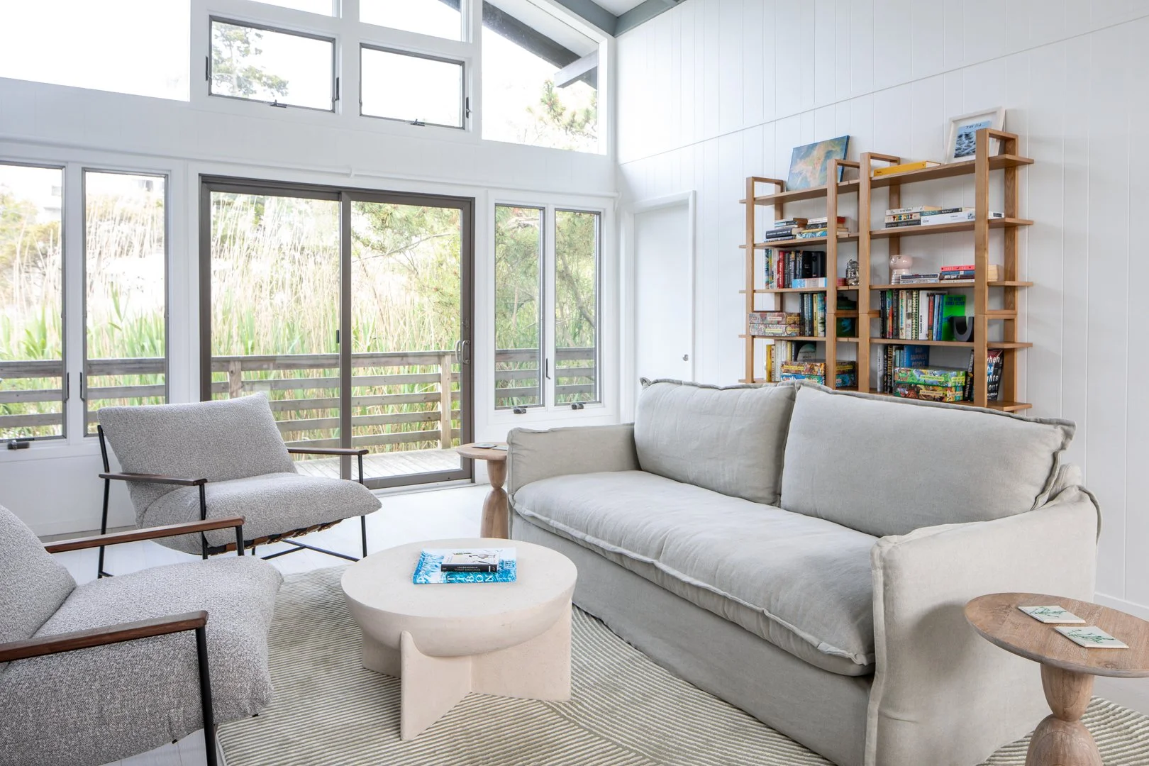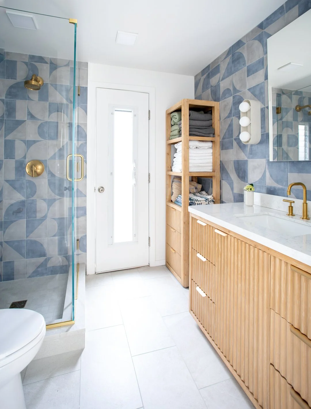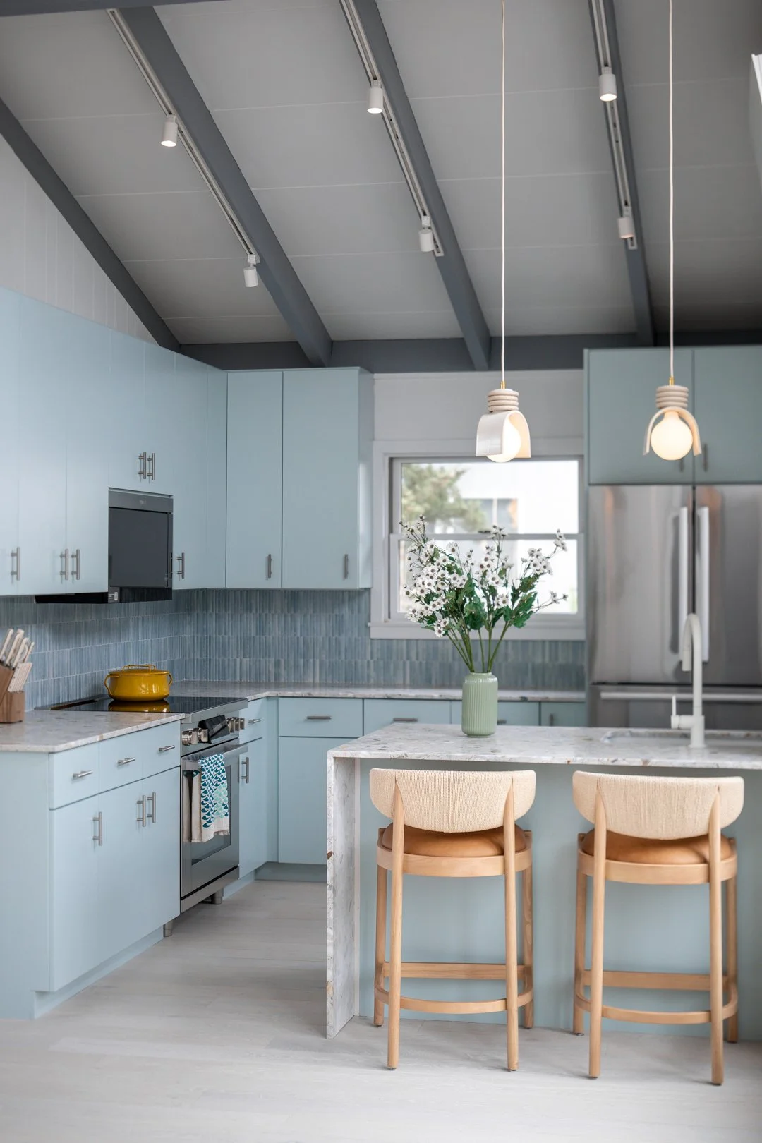 This project reflects the tranquil and bright atmosphere of the environment of Fire Island. Our team hand-selected finishes and furniture that focused on soft blue hues and natural materials to welcome in the spirit of the outdoors. Clear, quiet elements combined with unique tilework and wallpaper, transforms this space into a visually captivating, yet peaceful hideaway.